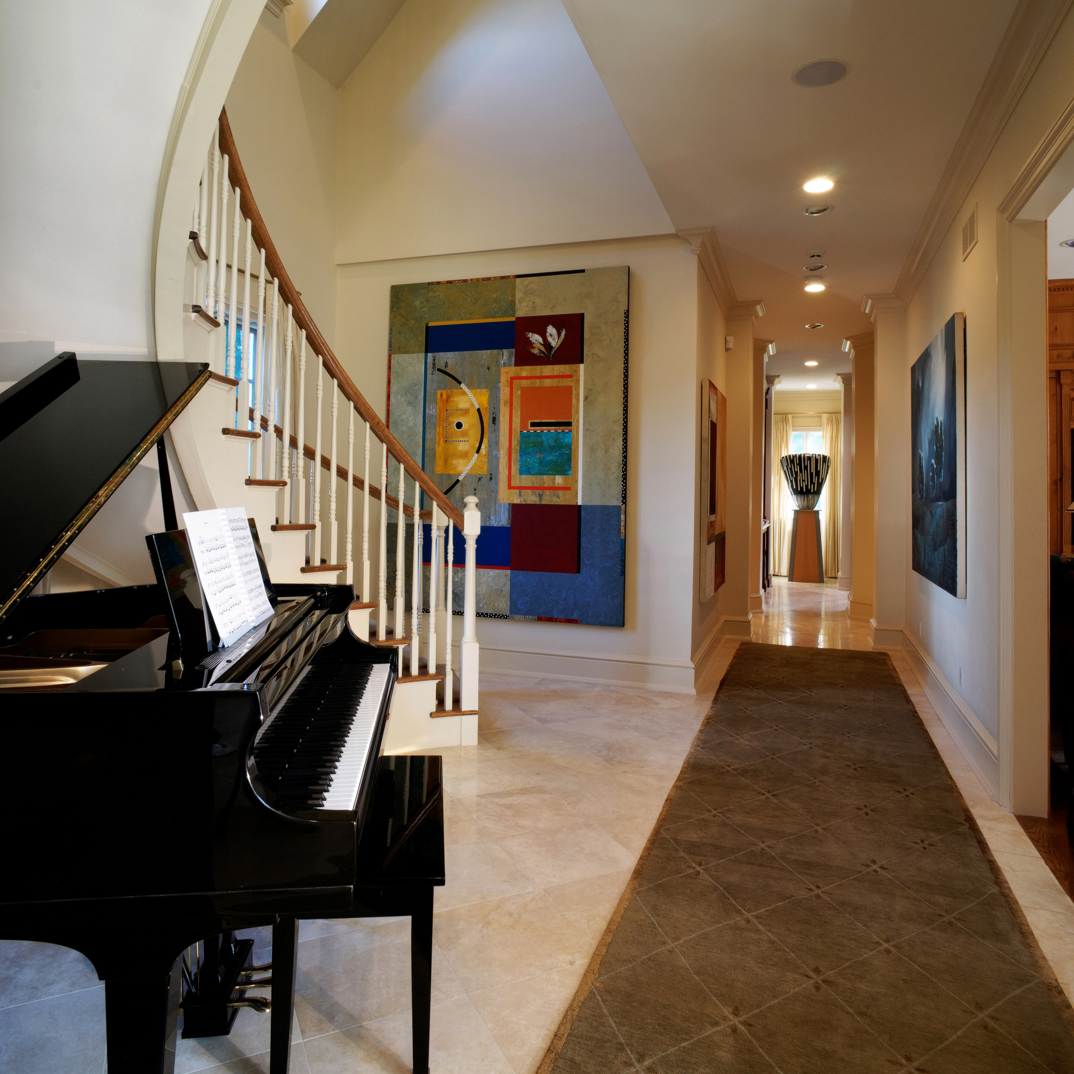 Soft tones set the stage for this in-house theater with a “Rock Music Theme”. Upholstered walls aid in the acoustical quality. A full entertainment area including sink and refrigerator compliment time down to enjoy a movie! Warm color tones were used throughout the main living spaces enhancing the Contemporary attributes of the residence with a blending of Classic design.